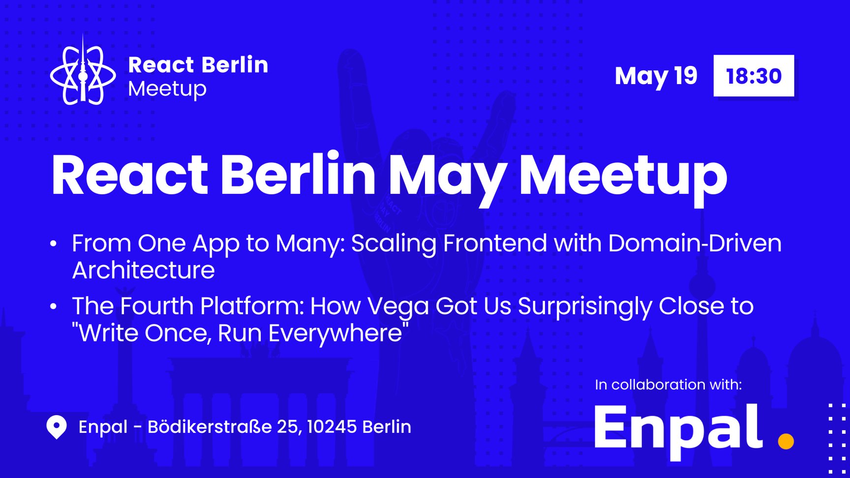 If you're an event organizer, or React enthusiast willing to collaborate, please reach us by mail, we're open to any kind of partnership - hi@reactday.berlin.